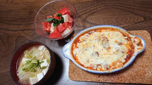 3月最終日のオヤジ料理となりますが、今週は明日4/1まで担当です❗ 今夜の夕食は、 サバ缶と豆腐のトマト缶煮込みでチーズ焼き 長芋とトマトの洋風サラダ風 残り物の味噌汁も登場です☺️ COOKPADレシピを自分で料理して何ですが、チーズ焼きは想定以上に簡単…